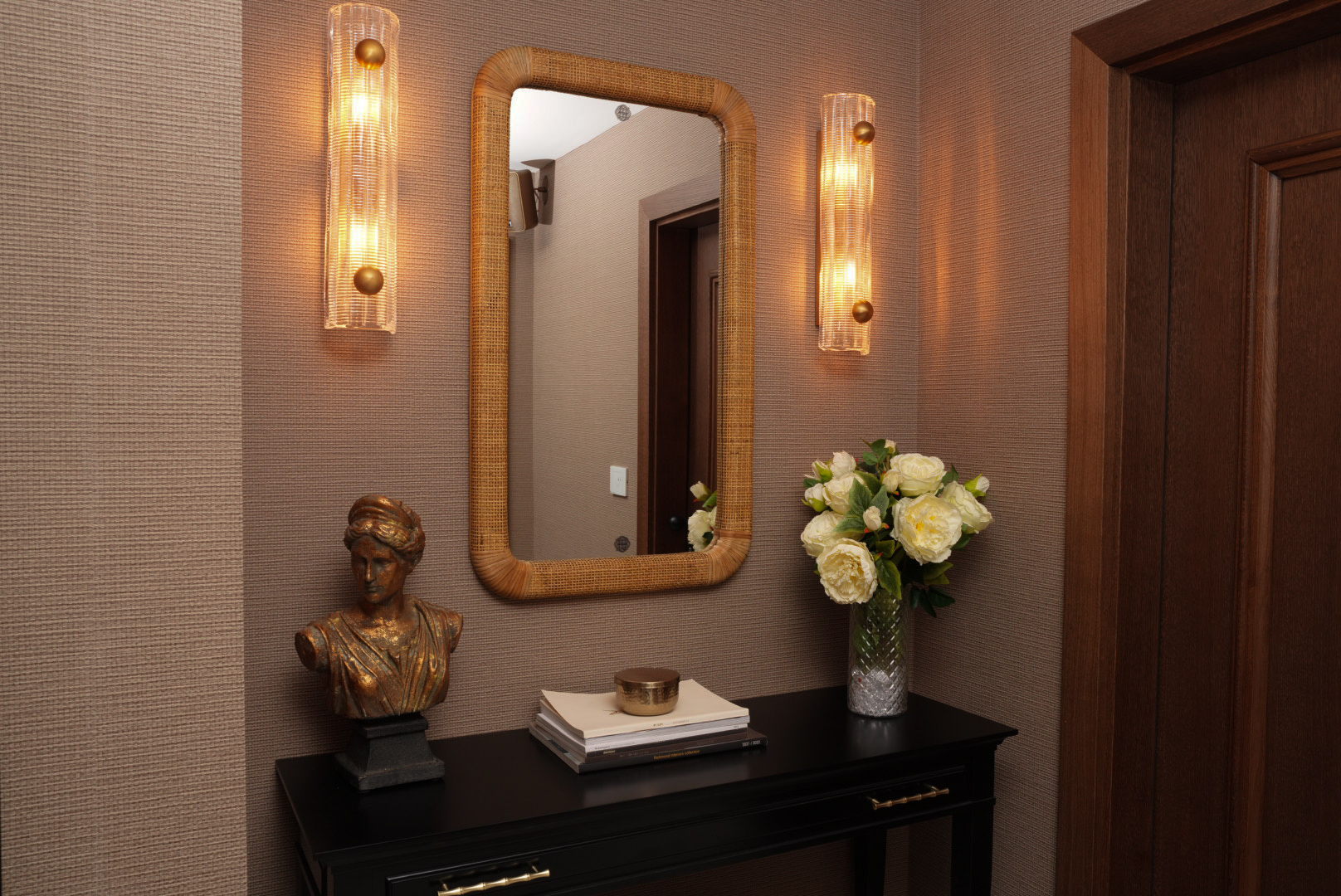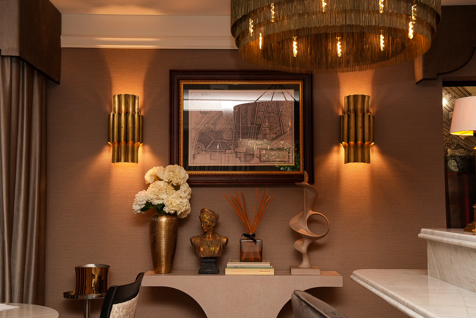 - Atmosfera i svjetlost: Glavni nosioci ritma su Eichholtz lusteri i lampe. Njihova mesingana konstrukcija stvara osjećaj večernje elegancije, dok zidne površine obložene grasscloth tapetama prostoru daju potrebnu taktilnost i toplinu.